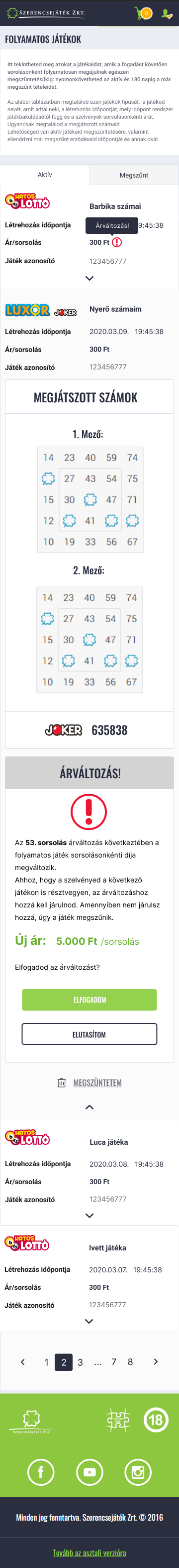 Ha több olyan folyamatos játékod is van, amelyet érint az árváltozás, akkor az új ár elfogadását mindegyik érintett folyamatos játékra külön kell megtenned! (Pl. ha 2 db Ötöslottó folyamatos játékod van, akkor az Ötöslottó árának változásakor mind a kettőnél külön-külön kell elfogadnod az adott folyamatos játék új árát.)